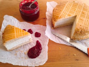A mai nap termése ez a vaníliás túrós pitetorta, házi, saját készítésű málnalekvárral.