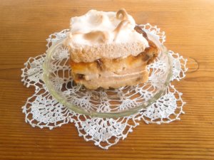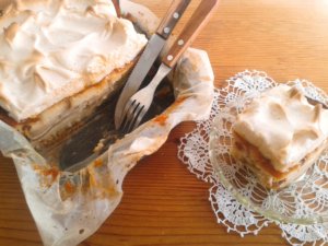 Ezt a krémet oszlatjuk el a sütemény tetején, majd kicsit megpaskoljuk a habot, hogy rusztikus legyen, és visszatoljuk a sütőbe rásütni a habot (lejjebb vesszük picit a lángot).