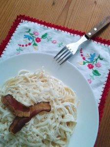 Tésztát kifőzöm, és összekeverem a tejföllel és reszelt sajtot szórok rá, majd díszítem a sült szalonna-ropogóssal. 🙂