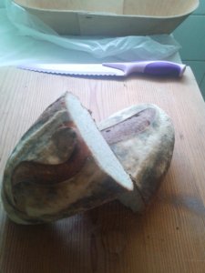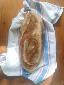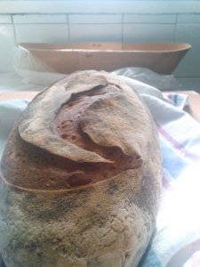 Ezt bedagasztottam, majd félóránként 3-szor hajtogattam, megmozgattam, majd végül formáztam és a kibélelt, kilisztezett kelesztő kosárba fektettem slusszal felfelé. Ez volt este 10-kor. Majd reggel 7 óra körül úgy láttam itt az idő a sütő begyújtásához. Max fokozat (mivel nem tudok pontos hőfokot állítani), és egy lábasban víz, ezt a sütő aljába tettem, és amikor jól előmelegedett, betettem már dísz-vágással ellátott kenyeret. Gőzzel max fokozaton ment fél órát, majd kivettem a vizet, megfordítottam a kenyeret, és lejjebb vettem a hőfokot, így még plusz fél órát sütöttem. (max 230 fok lenne, lejjebb vett kb 210 fok lenne). Mielőtt kivettem végleg, még egyszer fordítottam rajta, mert kicsit pirít a sütő hátulja. Kivétel után vízzel megspricceljük, hogy repedezett, extra ropogós legyen a héja (ezt most jól elfelejtettem, de magától is megajándékozott egy kis repedéssel. 🙂 ), majd rácson hagyjuk teljesen kihűlni. Amikor kihűlt, megvágjuk. 🙂