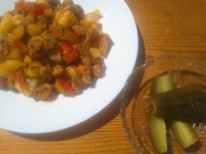 Ezalatt lereszeltem a fokhagymát, és a legvégén hozzáadtam a húsos részhez egy kevéske őrölt pirospaprikával pedig a ,,habot a tortára,,. A már kisült krumplival összekevertem, és kész. Lehet tálalni, savanyúsággal vagy kompóttal is mennyei szerintem. 🙂 (Én most a kis első kovászos uborkámmal tálaltam, mivel Nyár van. 🙂 )