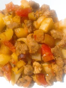 Amikor már majdnem jó volt a hús, hozzáadtam a felkockázott paradicsomot és paprikát, majd összepirítottam őket.
