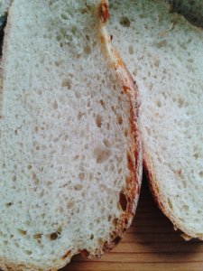 Miután kisült, azonnal megspricceltem vízzel a kenyeret, hogy szép cserepes-ropogós legyen a héja. És amikor kisült, megvágtam, és már ettük is. 🙂