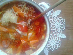 Zöldségeket elkockázzuk-karikázzuk, kolbászt is, és csak úgy hozzáteszem a káposztát, majd felöltöm vízzel, hogy ellepje ezt az egész mindenséget, majd felteszem főni. Sózom-fűszerezem, és míg puhára nem főttek a zöldségek, addig lassú tűzön néha belekavargatva főzöm. MENNYEI 🙂