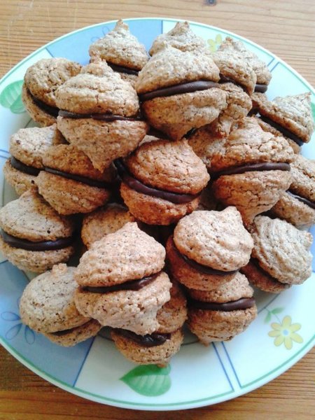 - A darált mogyorót és a porcukrot összekevertem egy tálban. A 4 fehérjét felvertem habbá a vaníliás cukorral. A sütőt alacsonyabb hőfokra előmelegítettem kb. 155 fokra, majd a tésztát nyomózsákba töltöttem s dió nagyságú csókokat nyomtam kipapírozott tepsibe. Készre sütöttem.