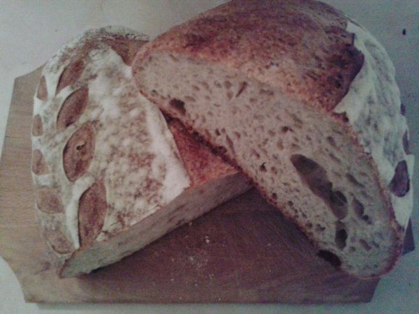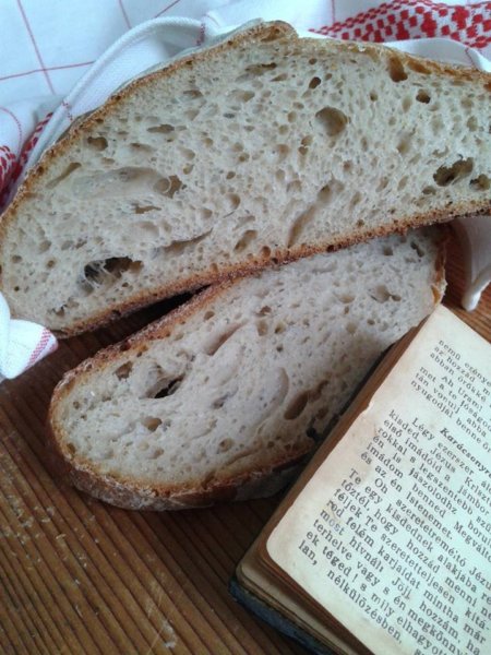 A lisztet a vízzel és a krumplival eldagasztom, majd hozzáadom a kovászt, dagasztom kicsit, majd ha jól elvegyült a tésztában, hozzáadom a sót, és kidagasztom. Kicsit ragacsos lesz a tészta a krumpli miatt, de lisztezett deszkán kicsit átgyúrhatjuk pihentetés előtt. Pihentetni egy letakart kiolajozott tálba tesszük, majd kb óránként 3-szor belehajtogatjuk a levegőt, s megtornáztatjuk a tésztánkat. Végül szintén kb. 1 órán át pihentetjük, majd szép kis cipót formázunk belőle és kilisztezett szakajtóba tesszük a kenyértésztánkat, s sütésig abban pihentetjük-kelesztjük. Nos ezen pihenési szakaszok egy dolog hogy egy igazi pékségben mennyi ideig tartanak, DE otthon teljesen más a körülmény, a levegő, a környezet, a hőmérséklet, s a gyakorlat is (pl. egy kezdőnek), más a kemence, vagyis a sütő, más a hőmérséklet, van aki tud magas hőfokot produkálni, míg egy régebbi sütő nem biztos hogy tudja, s már sem lesz OLYAN az eredmény, mint az internetes fényképeken… Nálam mindig HOSSZABBAK ezek az érési idők. Figyelni kell a tésztát, nem szabad megfeledkezni róla. Végül kisütjük. Magas hőfokon vetjük be a kemencébe majd visszább vesszük a hőmérsékletet, és szép pirosra sütjük. Vetés után adhatunk neki gőzt hogy húzza fel a tésztát. (Én ezt egy sütő aljába tett vizes edénnyel szoktam elérni, s kb 10 perc után kiveszem. de csak olyan fél óra után veszem kissé lejjebb a lángot alatta ((pont az miatt, mert nem tudok megfelelő hőmérsékletet biztosítani neki)), és szép mosolygósra sütöm.) 🙂 Nagyon nagy türelem és sok sütés kell a jó kenyér készítéséhez, s ez nem volt régen sem másképp, sem most a modern technikával körülölelve, de ez inkább hozzon közelebb a Kenyérhez, s tán máshogy fogunk rá tekinteni… eleink szemével.
