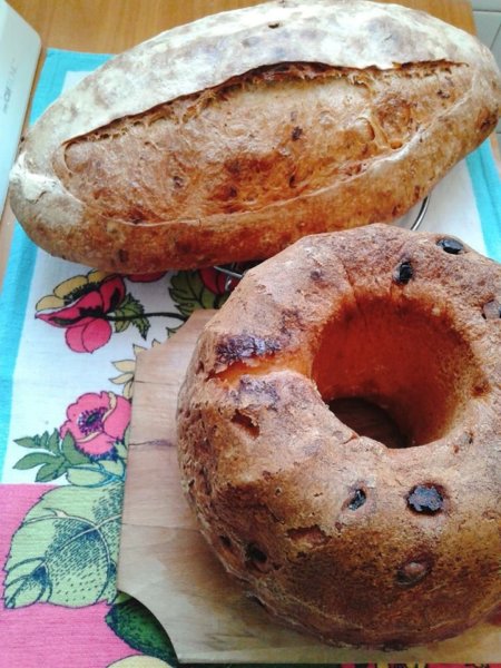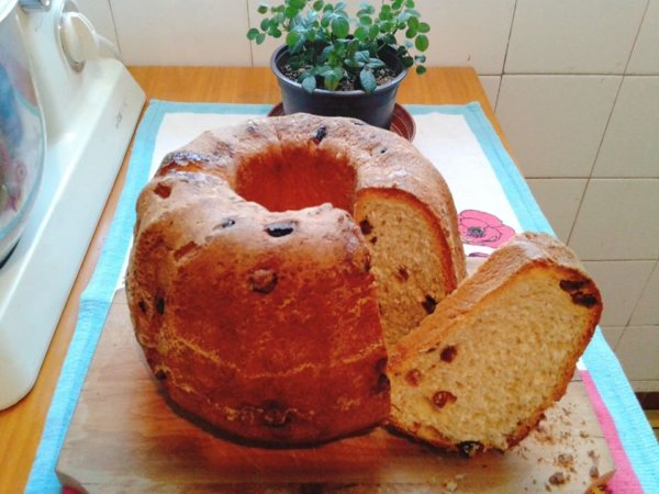 Nos tehát: Tisztelettel megjegyzem, hogy IGEN, MŰKÖDIK!!! Azzal a kovásszal, amit a kenyerembe is beledagasztok, ugyanazzal a kovásszal: MŰKÖDIK!!! 🙂 Sűrűbb lett a tészta, mint a kenyérnél, de hát jóval többféle is a hozzávaló. Tulajdonképpen minden alapanyag ugyanaz, mint egy “sima” élesztős kelt kuglófnál, csupán maga az élesztő van elhagyva, és kovásszal helyettesítve. Innentől már ugyanúgy dagasztottam a tésztát, mintha egy kelt élesztős kuglóf vagy kalács lenne. Utána pedig ugyanúgy jártam el mint ahogy a kenyérnél szoktam: pár órát pihent a tészta (nálam eléggé lassúak a tészták), majd meggyurmáztam kicsit, megint pihent, végül kissé kisodortam, karikát formázva beletettem a kivajazott-lisztezett kuglóf formába, és szépen ment pihenni a hűtőbe. Fura mód, lassú tészta lett… alig akart kelni, másnap reggel is nézem: semmi. Mondom ez “bedöglött” már tegnap is fura volt. Aztán elkezdtem főzni az ebédet, erre a melegedő konyhai klímára hirtelen elkezdett éledni… Előző délután még egy kenyeret is bedagasztottam, na az is úgy meg volt már indulva, hogy gyorsan be is vágtam a sütőbe, és a kuglófot kicsit kivittem a nappaliba, hogy nehogy kifújja magát mire kisül a kenyér. Ugyanúgy sütöttem a kuglófot is: a régi kis gáztűzhelyt kakaóra kapcsolva, vízzel jól megspriccelve a tészta, és be a sütőbe. Egyszer-kétszer be-be fújtam még vizet, majd kb. 25 perc múlva lejjebb vettem a lángot. Nagyjából 60 percet sült, a végeredménnyel nagyon elégedett voltam. Sose legyen ennél rosszabb a kenyér kovásza! 🙂 Recept a kép alatt: